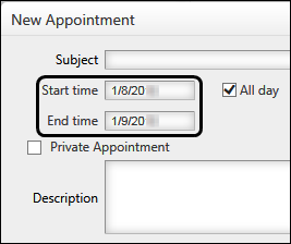 The New Appointment window opens.The window opens with either the All day check box selected or cleared, depending on which calendar you use to enter your time-off request.