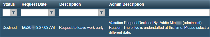 View Approved or Declined time-off request information in the data grid and detail pane.