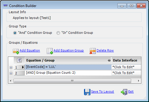 Use Save To Layout to save the condition equations to the grid layout identified in the Layout Info section. Use Exit to close the Condition Builder or the Sub-Condition Group window. |
