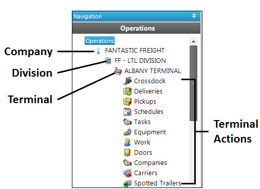 In TMW LTL Operations, you manage the movement of freight by terminal. The starting point for managing a terminal is the Navigation menu, which provides access to features used to pick up, consolidate, and deliver freight.