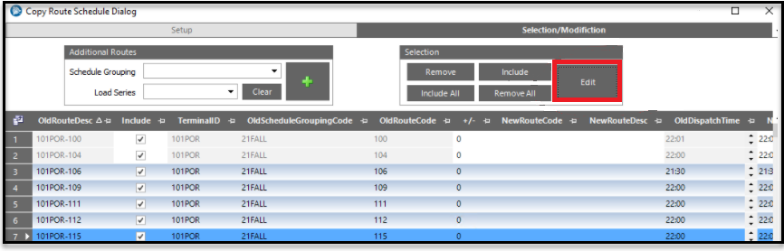 The multi-row edit process reached through the Copy Routes window quit working. The process has been repaired. Now, it is available through the Copy Route Schedule Dialog window’s Edit command. You do the editing in the Multi-Row Edit window.