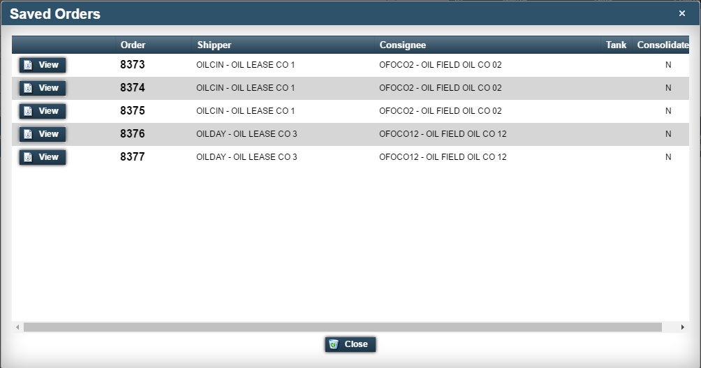 The Saved Orders window opens. It displays information about the order(s) created.This illustration shows three orders. In this case, two tanks were selected for the first shipper and one tank was selected for the second shipper. Note that the orders are consolidated.