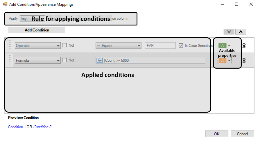 The Add Condition/Appearance Mappings window is the starting point for all conditional formatting.