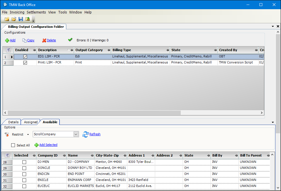 The system retrieves a list of Bill To companies that meet your restrictions.