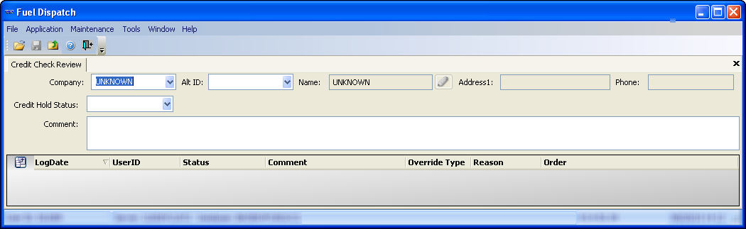 In Fuel Dispatch, the statuses are listed in the Credit Hold Status field in the Credit Check Review window accessed from Application > Credit Check Review. Here, you assign the appropriate credit status to a company.