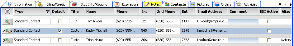 You use the Contacts tab to record information about the contacts with whom you do business at a company. In this illustration of the tab, information for three contacts is shown. By default, you see an expanded view of all information for all contacts.