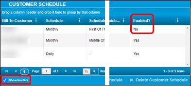 The Enabled? column of each pane shows whether a schedule is active or inactive (that is, enabled or not enabled). In this illustration, the user has selected Show Inactive in the Customer Schedule pane. The page refreshed to show active and inactive customers. The Enabled? column shows that the first customer schedule is inactive, because the column shows No.