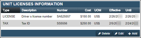 The Licenses tab allows you to track licenses, permits, and stickers for each unit. License types may vary, depending on your system setup. If your company tracks unit expirations, such as license plates or stickers, you must add those expirations to the unit’s master record.
