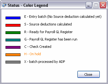 Selecting the 'Status Color Legend' option simply brings up a window detailing the statuses that the various text colors in the Payroll Processing program refer to.