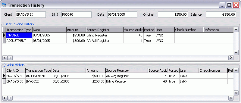 2. Once the top grid fills with the correct client name, the bottom grid will fill with invoices relevant to this client. Select the invoice you wish to void, and use your Context Menu (right-click) to select 'Transaction History'.