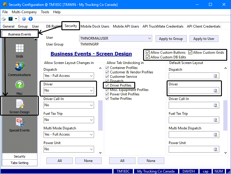 These settings control which users are allowed to modify the screen layout, perform the tab undocking function and whether custom grids, buttons and database edits are allowed.