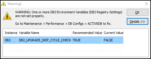 If the parameter is set to FALSE, a warning message about DB2 Registry Settings will appear when users are logging into any TruckMate application. You can set the parameter to TRUE using DB2 commands or by using the TruckMate SQL Execute > Performance menu > DB2 Configs function.