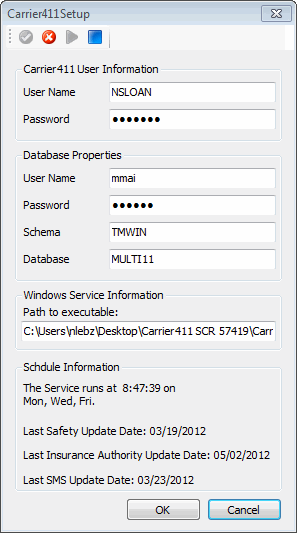 The setup screen will allow the user to supply the Carrier411 system 'User Name' and 'Password' to allow the service to sign-on to the Carrier411 system automatically. The Carrier411 system username and password are also very important as they will be used on sign-on to the application to connect to the Carrier411 system. Inputting the correct data in this screen is crucial to the proper functioning of this application.
