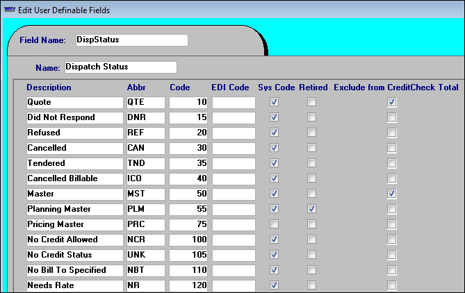 In the DispStatus label, the Quote and Master system code options have the checkbox selected by default.