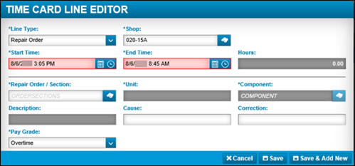 Note: When you select a line type to add and update your start time, both the Start Time and End Time fields are highlighted in red, indicating that the time range is not valid. When you update the End Time, the red highlight disappears and the update is accepted. This happens regardless of whether you selected the line type of Repair Order, Indirect, Break (unpaid), or Break/Lunch (unpaid).