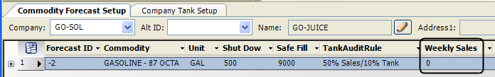 A commodity forecast includes the tank information you recorded in the Company Tank Setup window’s Tanks tab, the estimated weekly sales volume for the commodity, and the number of weeks' worth of readings on which the forecast is based.
