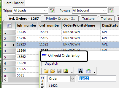 First available in Fuel Dispatch 17.60 If you are set up to work with oil field orders, when you double-click on an order in the Card Planner or Planning Worksheet, the system opens an instance of the Oil Field Order Entry window. It does this for all orders, even those created in Call On Demand Order Entry. |