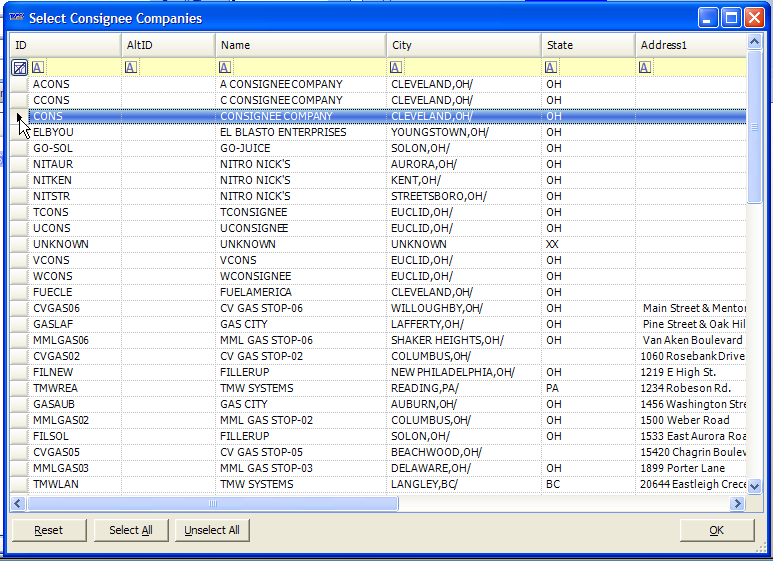 The Select Companies window opens. It displays a row for each company in the database identified as the type of company noted in the window name.