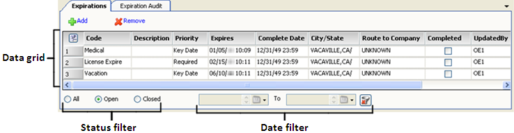 The Expirations tab in the Driver/Asset Expirations window enables you to add, delete, complete, and view expirations. The bottom section contains filters for specifying the status and date range of the expirations displayed in the grid.