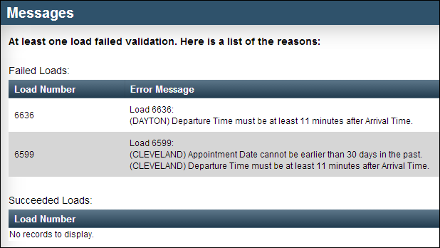 If there are no errors but the arrival or departure information is incomplete, the saved load is incomplete and remains in the Select Multiple Loads list.