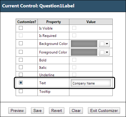 4. For the Text property, select the checkbox in the Customize? column.