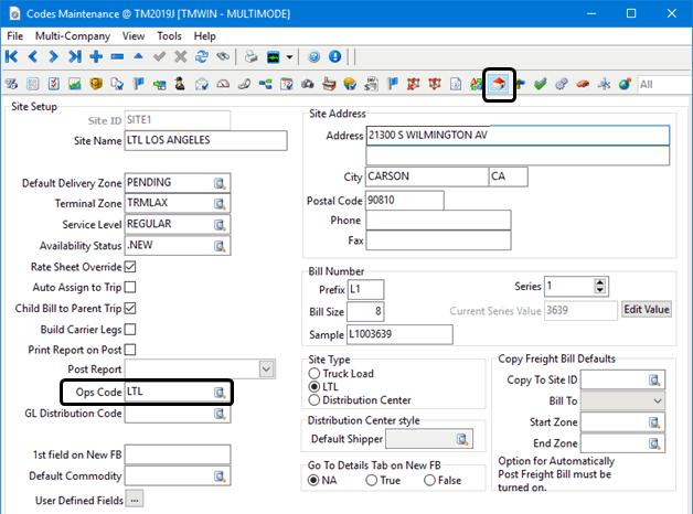 Default values for the Operations Code assigned to a new freight bill comes from the Site Code associated with the freight bill but the default value can be overwritten and a different Ops Code can be selected a freight bill.