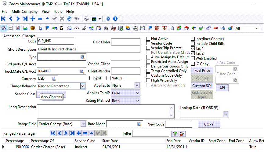 The Codes Maintenance program > Accessorial Charges tab was updated in several ways to allow for accessorials to apply based on how the FB was rated and moved.