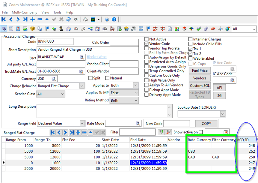 In this illustration, the ACD ID column displays the ID that appears in client or vendor accessorial grids if used for auto-rating an accessorial.