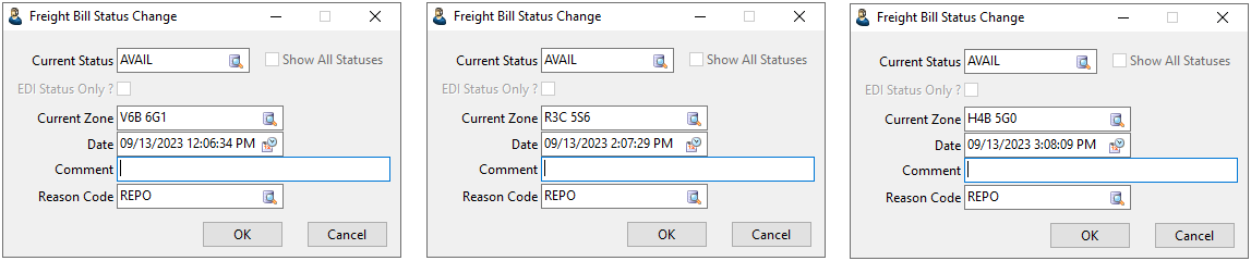 The offset adjusts the zone in accordance to the value in the zone rather than the time zone of the machine. For example, if the local machine time zone is Pacific Time, and the time is 12:00 PM, the value in the Date field on the Freight Bill Status Change window changes based on the zone. Daylight Saving Time (DST) values are applied if the option is selected for the zone.