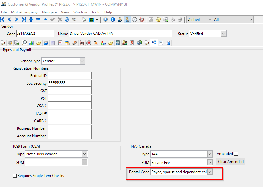 To fulfill a new Canadian Revenue Agency requirement to provide driver and vendor dental coverage information for T4as, a new Dental Code field has been added to these windows: