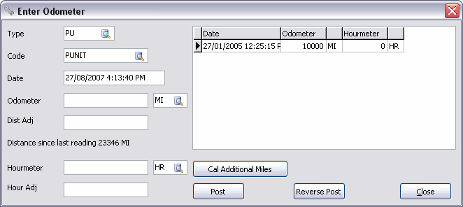 Click on the Odometer Readings button to bring up the Enter Odometer window, used for entering mileage and hour readings. Previous mileage and hourmeter readings for the unit will display in the grid.