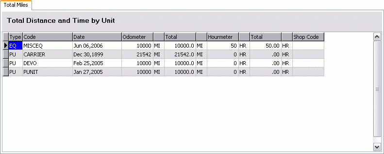 The Total Miles Tab displays the current mileage and hour entries for all units. This tab contains the opening mileage and hour values entries for your equipment. Subsequently, ongoing entries are made on the Odometer Reading Tab. Note that mileage and hour entries can also be made in the R&M Work Orders program.