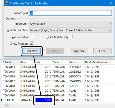 Throughout TruckMate, data is displayed in a grid format of columns and rows. The rows represent individual data records and the columns represent fields as described by the labels in the column header. In most cases, the screen is not large enough to display the entire grid. The scroll bars at the bottom and the right of the grid are used to move the grid display.