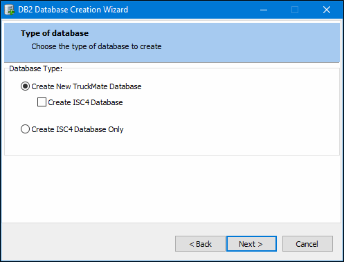 2. The Type of Database page lets you decide whether to create a new security (ISC4) database in addition to or instead of the TruckMate database. The ISC4 database controls user access to the TruckMate DB2 database.