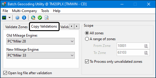 The Copy Validations Tab allows you to copy existing zone validations from one Mileage Engine to another. This functionality makes it easier to upgrade when using a new Mileage Engine. If the customer goes from PC*Miler 31 to PC*Miler 33 for example, they can use this tab to copy their old PC*Miler 31 zone validations to PC*Miler 33. This means that the User doesn’t have to re-validate their entire Zone tree. This functionality only works between different versions of the same Mileage Engine. For example, from PC*Miler 28 to PC*Miler 33.
