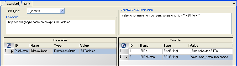 This example shows that the DisplayName is determined by an Expression(String) with a variable of BillToName. Additional commands must be entered in the Variables and Expressions sections of the window to address this BillToName value.