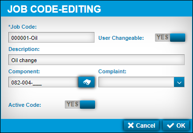 You use Job Codes to establish a baseline for activities, such as an oil change or a front brake repair. You establish a Job Code for a component code.