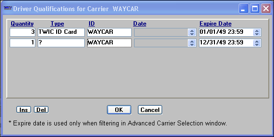 Select the type of qualification that the carrier’s driver has acquired. Note: The options are set up in the DrvAcc label, accessed in System Administration. |