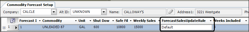 There may be times when a store has added or replaced a tank. The Commodity Forecast Setup window must be in sync with the store’s tank setup to ensure that data flows smoothly throughout the system. Failure to update the commodity forecast can produce unexpected errors when entering tank readings or viewing forecasted orders.