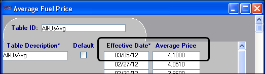 You can set up multiple Average Fuel Price tables based on your individual needs. For example, you may wish to create different tables for different Bill To companies or for different geographical regions, etc.