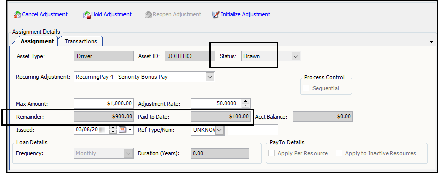 Save.Notice that the Status changes to Drawn and the Remainder and Paid to Date fields are adjusted by your initial deduction.