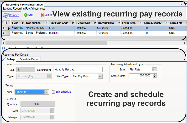 You set up recurring pay in the Recurring Pay Maintenance window. To access the window, go to Tools > Setup > Recurring Adjustments > Recurring Pay Maintenance.