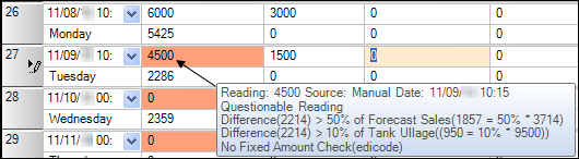 | The forecasted sales for the day come from the tank’s commodity forecast setup. In that setup, you specify the expected sales for a week, and then assign a percentage of that amount to each day of the week. For more information, see Commodity Forecast Setup. |