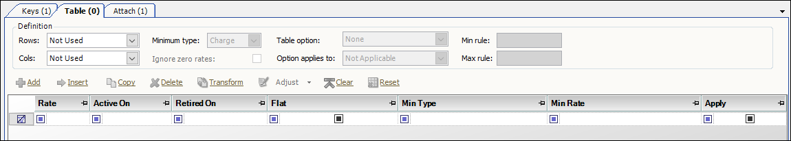 When setting up rate tables, your selection in the Rows field and the Col’s field define what the rows and/or columns in the table mean.