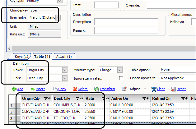 The charge type or pay type selected in the rate header determines billing or pay units. This example is using a mileage-based charge type, Freight (Distance).