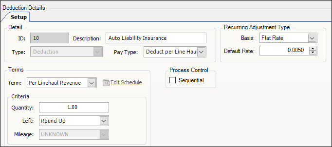 Enter a different quantity to apply the deduction based on a specific number of miles, trip segments, or line haul revenue. For example, for Per Miles, you would enter 100 to apply a recurring deduction for every 100 miles driven.