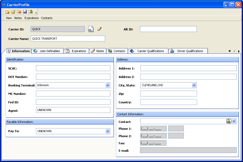 Displays general carrier profile data from File Maintenance. The data is grouped in these categories: Identification, Address, Payable Information, and Contact Information.