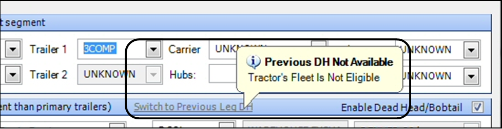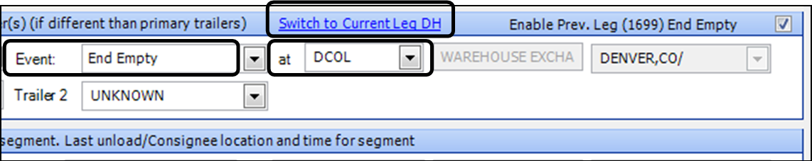 If the Switch to Previous Leg DH hyperlink is gray or invisible, the tractor or the previous trip does not meet the required conditions. See Allowing an empty move to be shifted to the end of the tractor’s prior trip. Review your setup and tractor selection. If you continue planning with the current tractor, the empty event will not be moved to the previous trip.