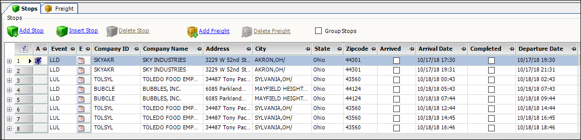 The Stops grid displays the stops from each order in the Orders to Consolidate grid. By default, stops are grouped together by order. However, you can manually re-order the stops. For information on re-ordering the stops, see Resequencing the stops on consolidated orders.