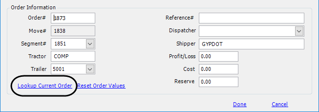 The system populates the Move #, Segment #, Tractor, Trailer, and Shipper fields in the Order Information section. The fields are set to read-only.